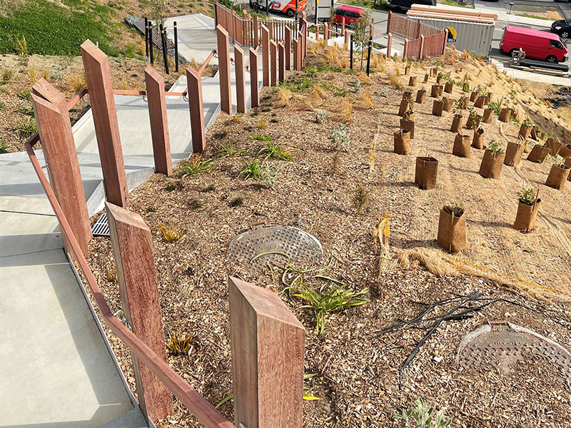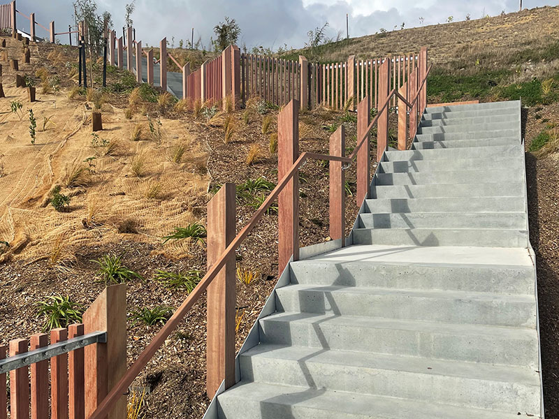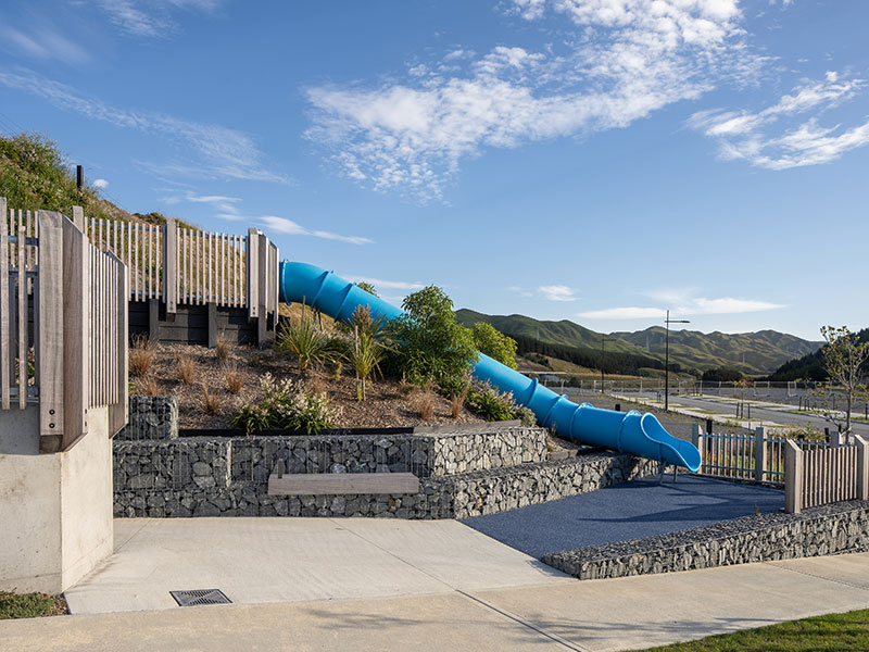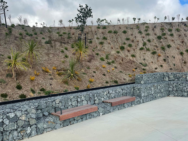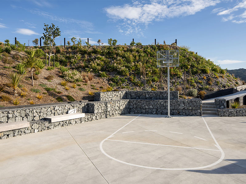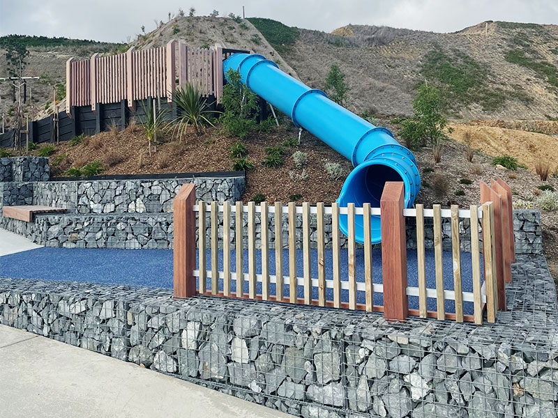 Our construction work included: the installation of a large gabion basket wall, the build of access steps linking up the 3 areas (which have a vertical climb of 51 metres), the creation of play spaces, a basketball court and the development of a children’s area with a slide.